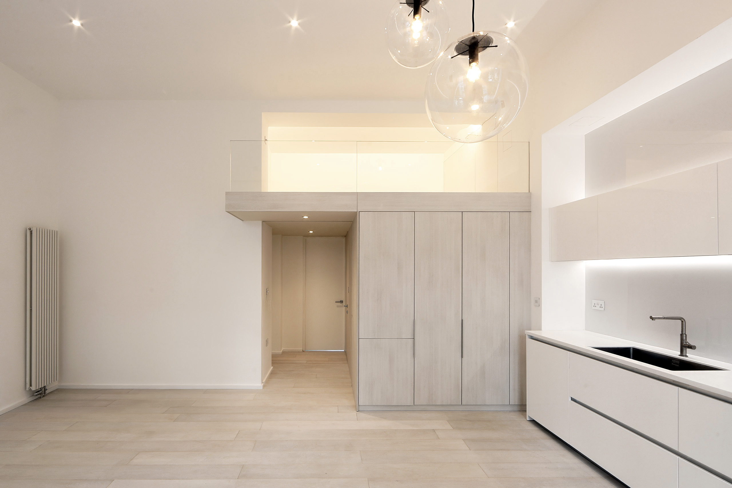 Non-original partitions and dropped ceilings were removed, creating an open plan kitchen and restoring the rooms original proportions. The central bathroom was redesigned at a part-height ‘pod’ which allowed a small mezzanine with frameless glass balustrade to be installed above it, providing an occasional sleeping area. The pod also discreetly housed several kitchen elements, including a fridge and larder.