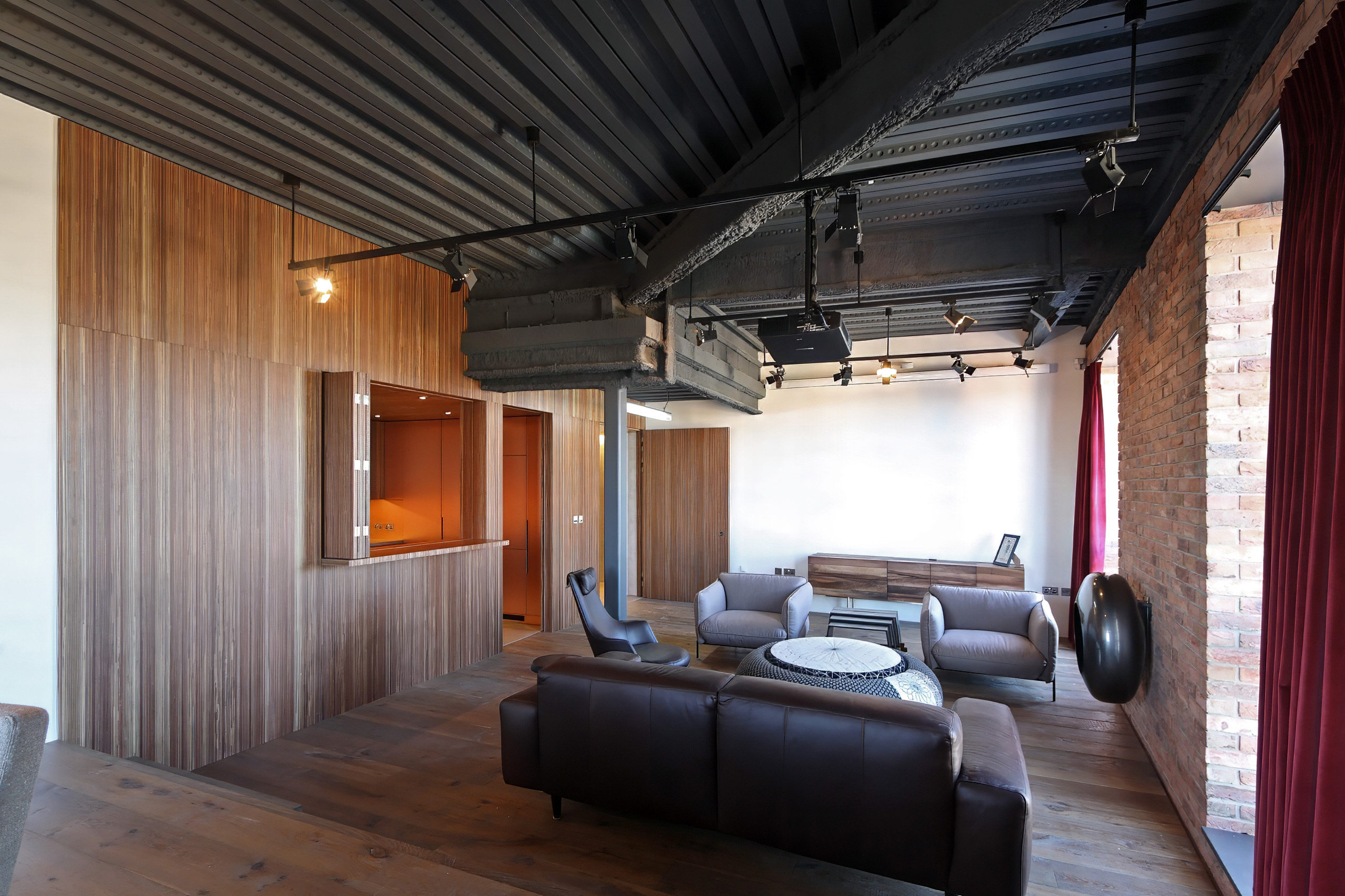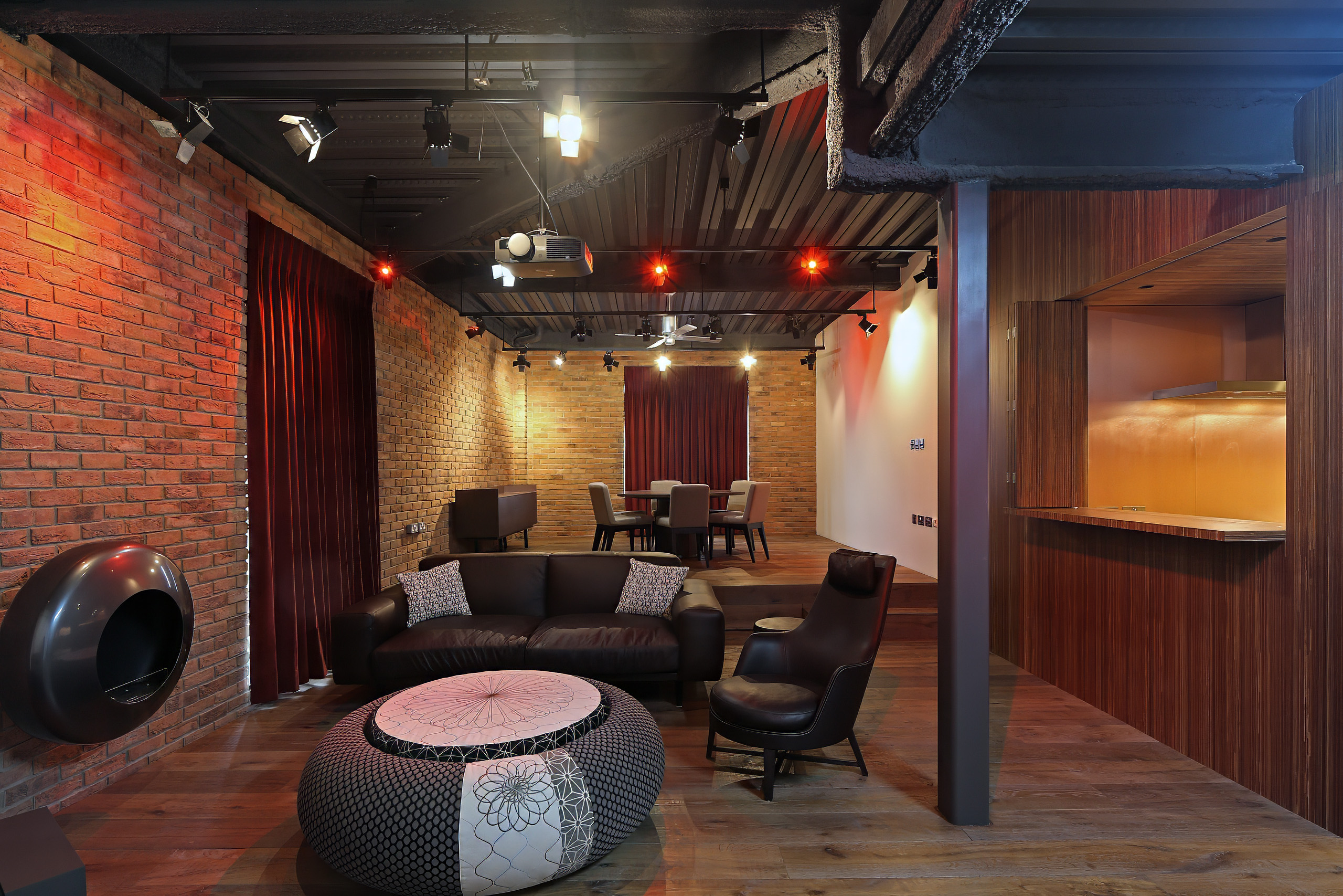 Hatterwan designed the lighting scheme for the project. In the main space a series of ceiling-mounted rails carry miniature stage lights with barn doors, and a projector is hung from the ceiling to project backdrops directly onto the lounge walls.