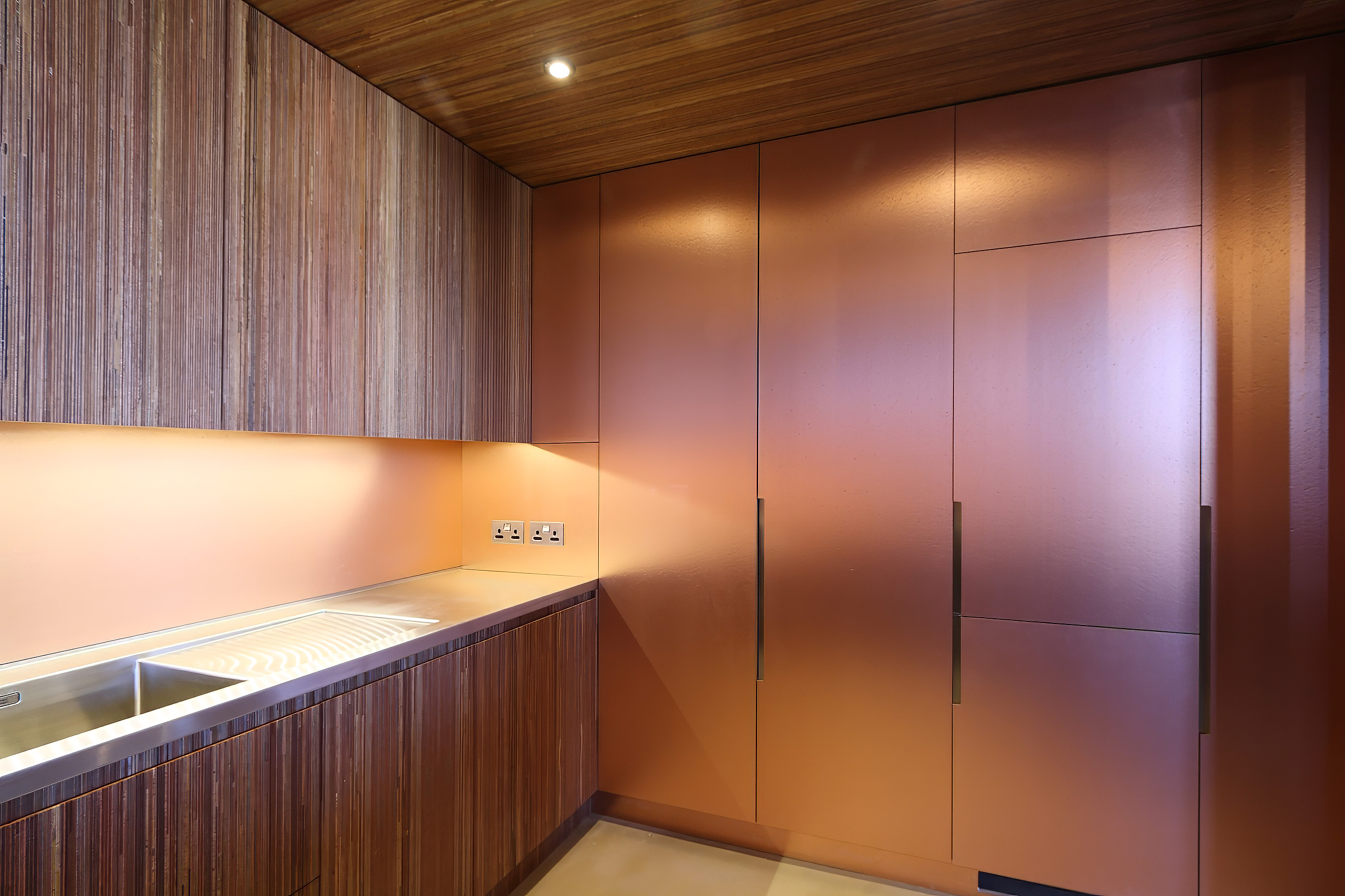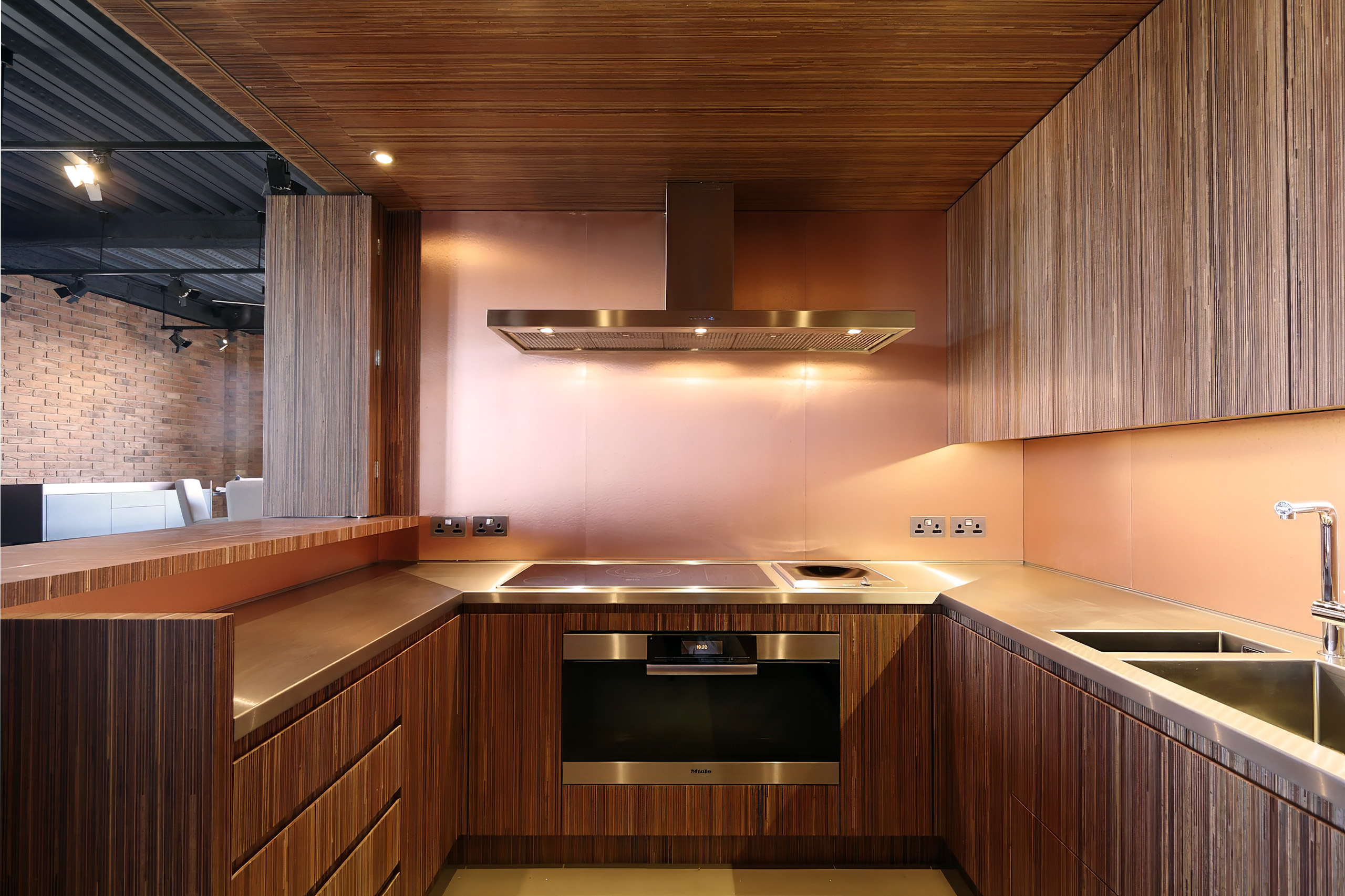 The kitchen featured joinery with bright copper laminate (referencing the warehouses’ history as a gin distillery), end-on merbau plywood panelling, and stainless-steel worksurfaces.