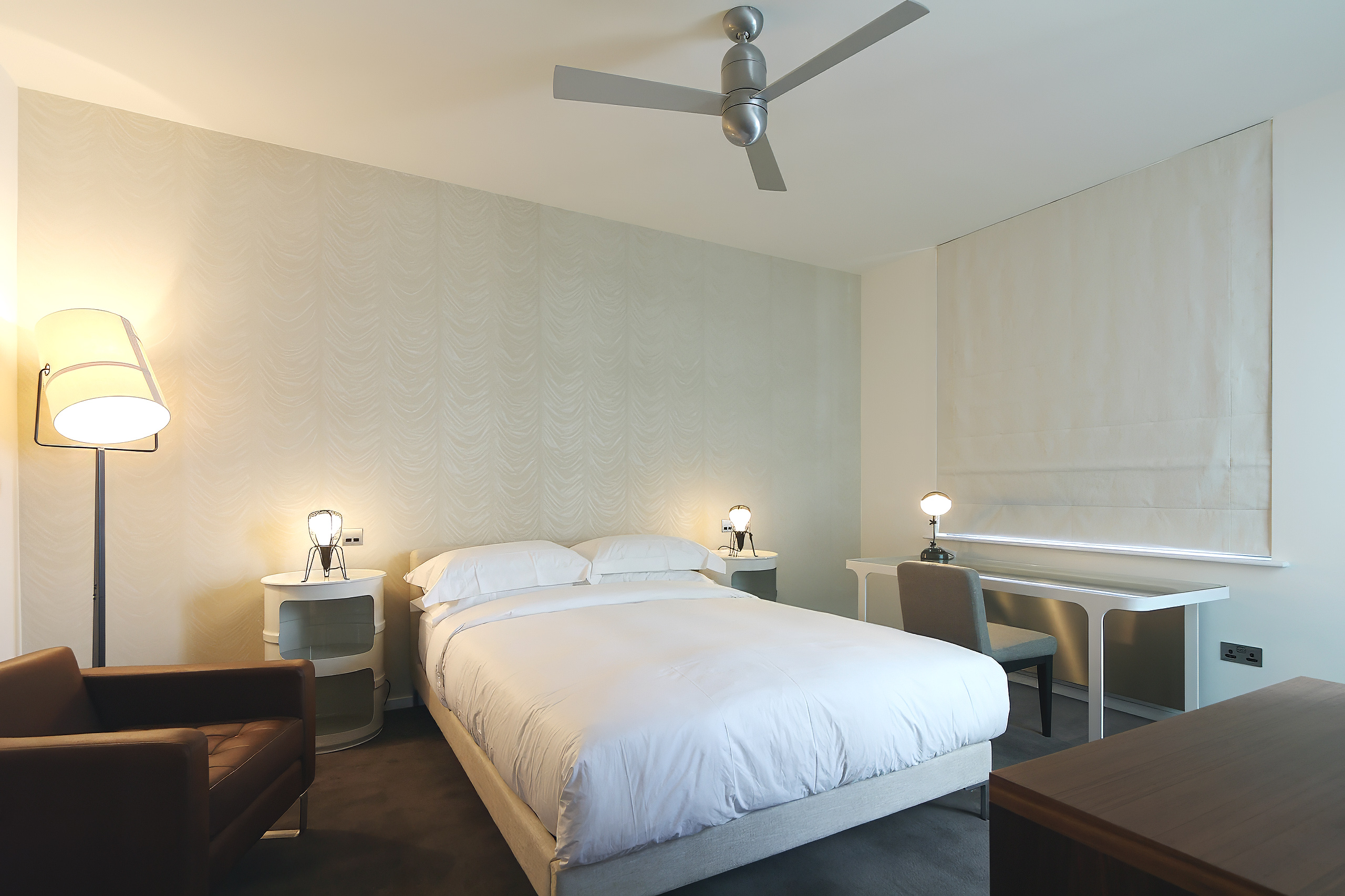 The upstairs spaces employed a lighter and gentler palette, but still keeping an industrial edge. Paler tones and subtly patterned wallpapers soften the bedroom spaces in comparison to the floor below.
