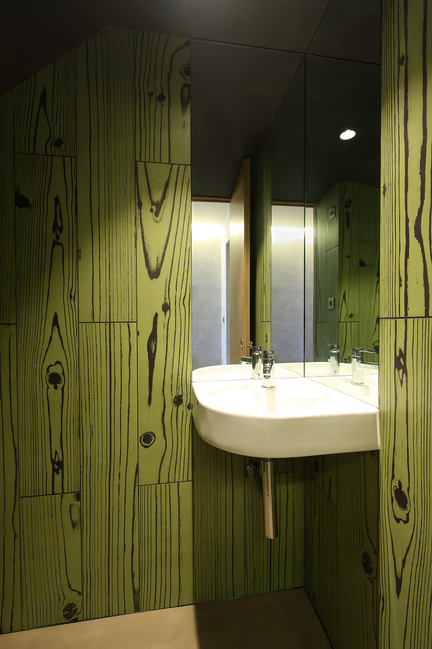Bathrooms featured stainless steel mosaics, Corten effect tiles, and angular sanitaryware. A hidden powder room set below the main staircase has a bright green tile, creating an impactful surprise when the door is opened.