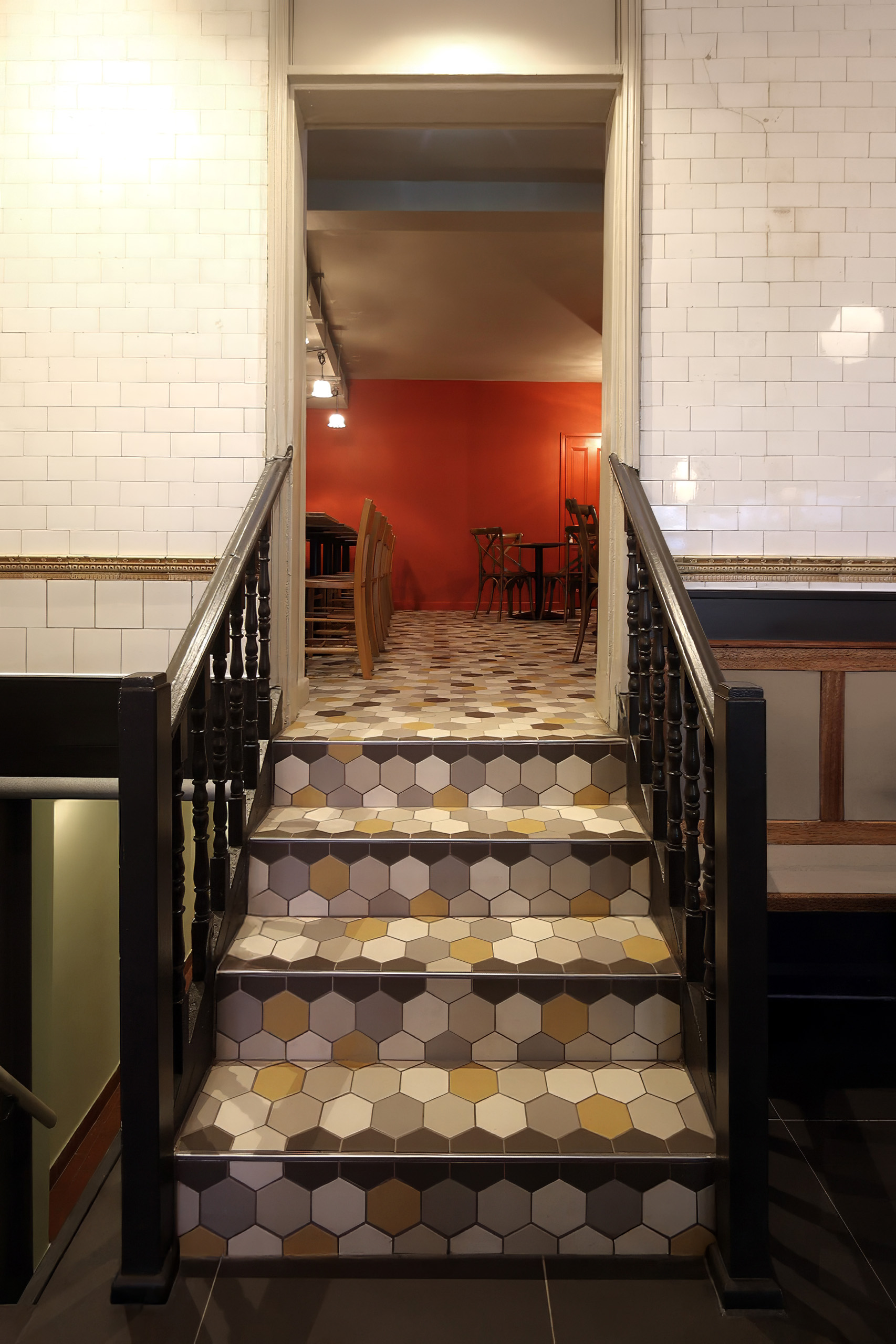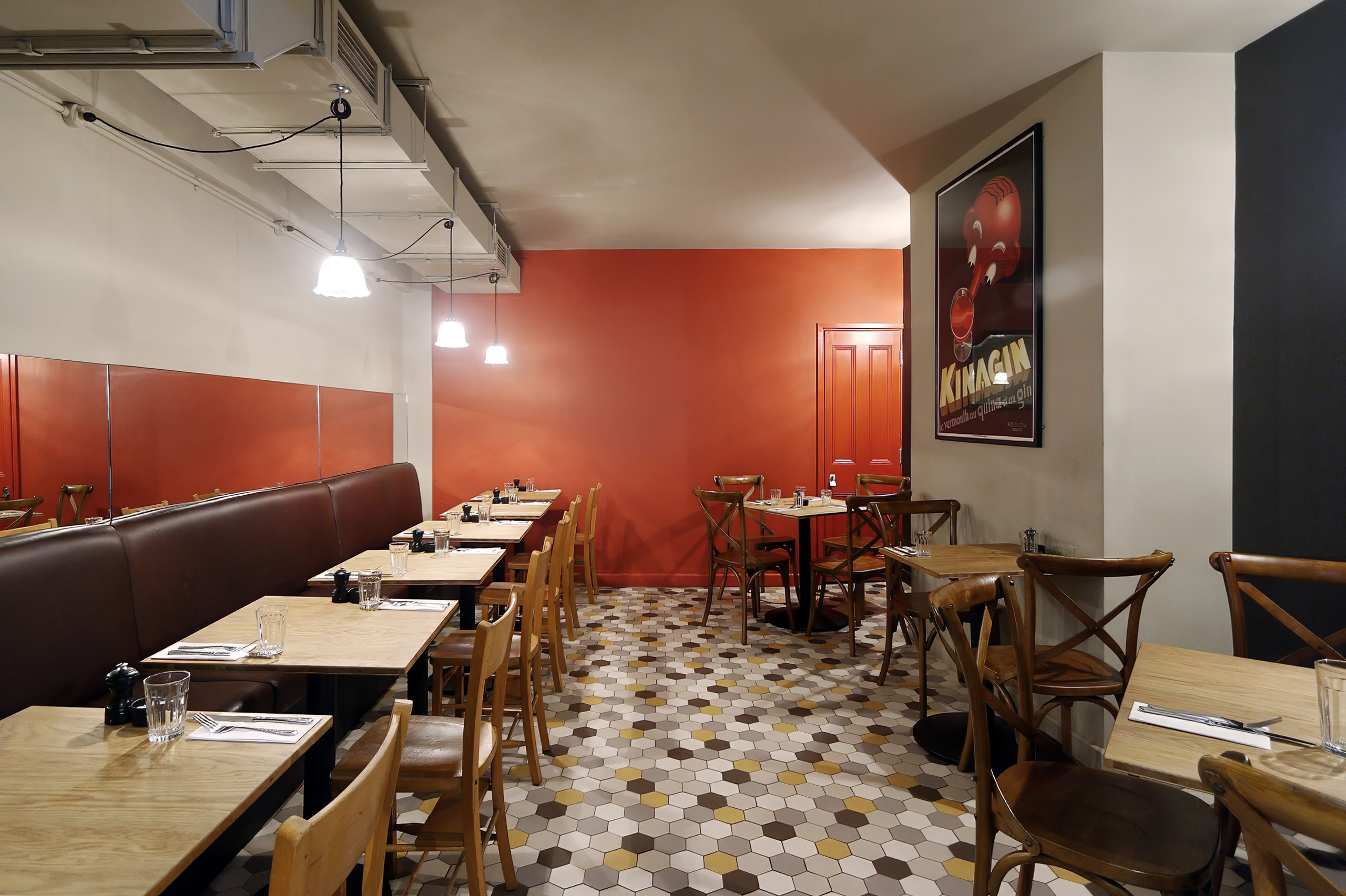The site previously operated as a Pie and Mash shop, and the refurbishment incorporated original tiling into the design, complements with a strong, vibrant palette with a patterned floor.